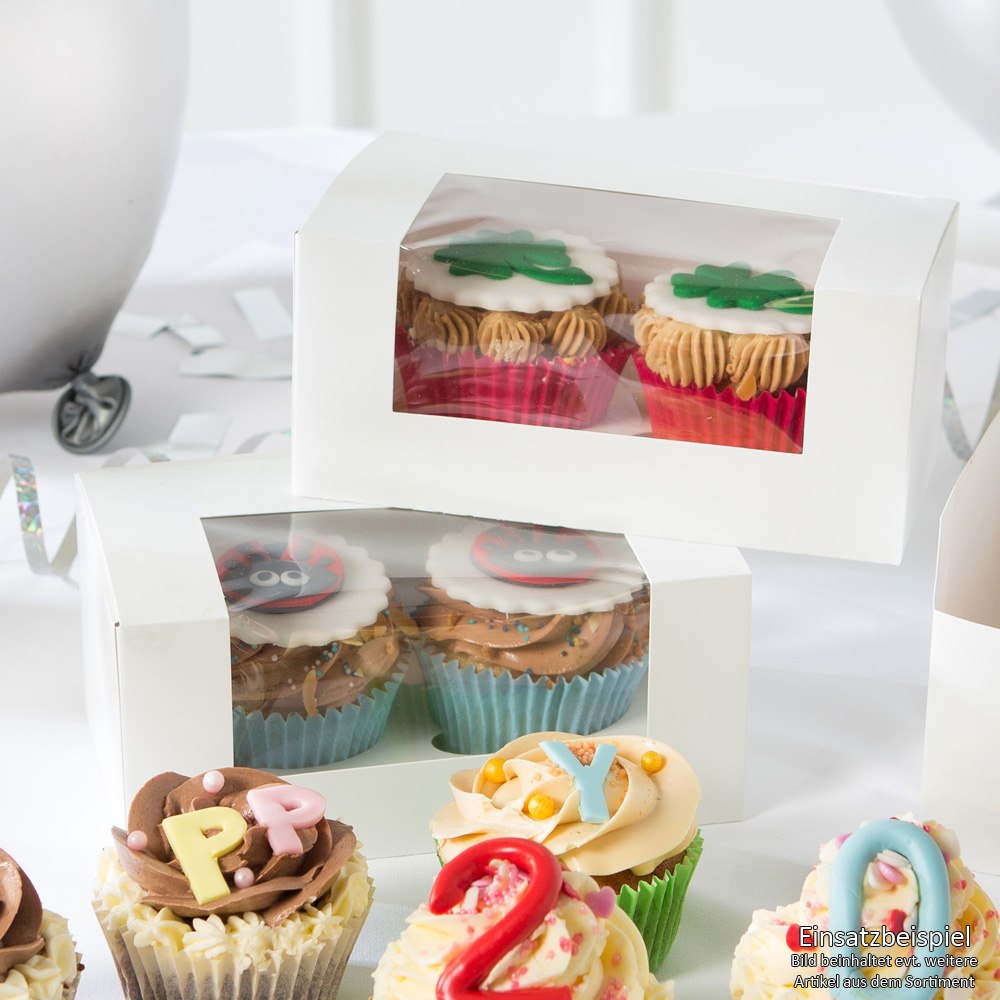 - DEKOBOX: Durch die weiße Außengestaltung der Muffin Schachtel und das hochwertige Folienfenster sind die Produkte im Inneren der Cupcake-Box äußerst dekorativ in Szene gesetzt