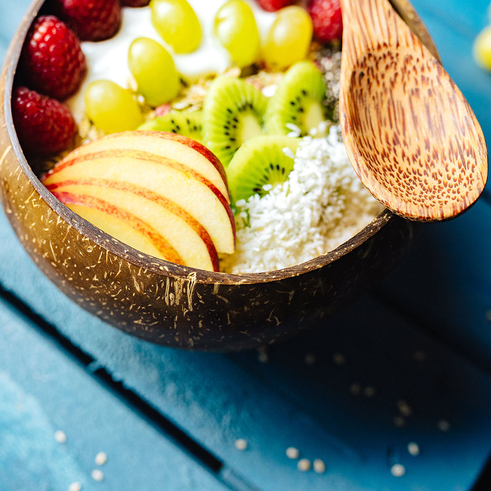 Nachhaltige Kokosnuss Schale mit Löffel im 2er-Set von BIOZOYG - Unsere Coconut Bowls sind so umweltfreundlich, weil sie zu 100% ein Naturprodukt sind und das Material der Kokosschalen so vor dem Abfall und Verbrennen gerettet wird. Die Kokos Schalen werden in Vietnam angebaut, geerntet und schließlich in liebevoller Handarbeit zu unserer Holzschüssel verarbeitet. Anschließend wird die Kokosbowl noch mit Kokosöl poliert. So naturbelassen kann die Kokosschalen Schüssel immer wieder verwendet und letzten Endes kompostiert werden, da sie biologisch abbaubar ist. Das macht unsere Kokosnussschüssel zu einer nachhaltigen Lösung und einer tollen plastikfreien Alternative. Da es sich bei unseren Schalen um Natur-Kokosschalen handelt, hat jede Cocosschale ein individuelles Design und ist ein echtes Unikat. Die genaue Farbe und Maserung sowie die Größe können leicht variieren. Die Länge der 2 Holz-Löffel beträgt 16cm. In unserer Holz Bowl können Sie nahezu alles genießen, wonach Ihnen der Sinn steht - ganz egal ob es flüssig, fest, fettig oder trocken ist. Man sollte zum Schutz der Kokos Schüssel lediglich darauf achten, dass die Speisen nicht über 70°C heiß sind. Am Besten waschen Sie die Cocosnuss Schale von Hand mit lauwarmem Wasser und einem weichen Geschirrtuch. So können sie bedenkenlos als Müslischalen und Smoothie Bowl oder genauso als einfache Deko-Schale verwenden. Nachhaltige Produkte müssen nicht zwingend Verzicht bedeuten. Unsere Coconut Bowl ist das beste Beispiel dafür. Mit unseren nachhaltigen, wiederverwendbaren Cocosnussschalen können Sie Ihren Lebensstil ganz einfach ein kleines Stück nachhaltiger gestalten und Plastik aus Ihrem Leben verbannen. Lassen Sie uns gemeinsam mit unserem Bowls Set unseren faszinierenden, einzigartigen Planeten schützen und ein Stück besser machen.
