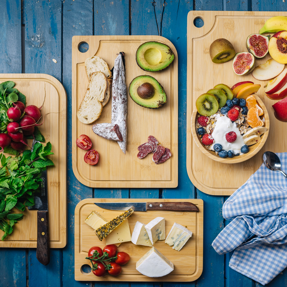 - KÜCHENBRETTER MIT SAFTRILLE passen in eine moderne Tischdekoration z.B. als Bambus Servierplatten zum Anrichten von Antipasti Tomate-Mozzarella - Appetithäppchen oder als Wurst- und Käse-Platten