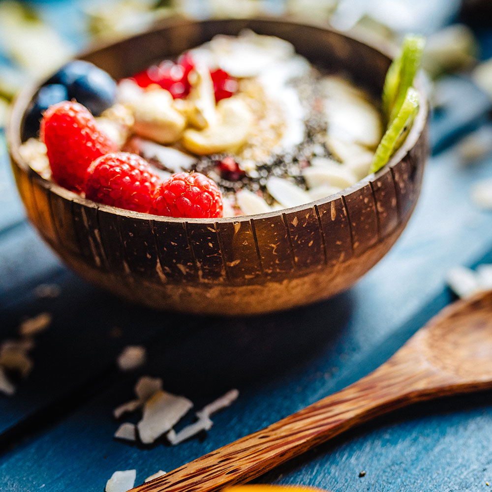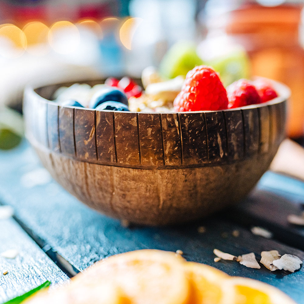 Nachhaltige Kokosnuss Schale mit Löffel im 2er-Set von BIOZOYG - Unsere Coconut Bowls sind so umweltfreundlich, weil sie zu 100% ein Naturprodukt sind und das Material der Kokosschalen so vor dem Abfall und Verbrennen gerettet wird. Die Kokos Schalen werden in Vietnam angebaut, geerntet und schließlich in liebevoller Handarbeit zu unserer Holzschüssel verarbeitet. Außerdem bekommt jede Kokos Schale eine individuelle Gravur im Boho-Style. So naturbelassen kann die Kokosschalen Schüssel immer wieder verwendet und letzten Endes kompostiert werden, da sie biologisch abbaubar ist. Das macht unsere Kokosnussschüssel zu einer nachhaltigen Lösung und einer tollen plastikfreien Alternative. Da es sich bei unseren Schalen um Natur-Kokosschalen handelt, hat jede Cocosschale ein individuelles Design und ist ein echtes Unikat. Die genaue Farbe und Maserung sowie die Größe können leicht variieren. Die Länge der 2 Holz-Löffel beträgt 16cm. In unserer Holz Bowl können Sie nahezu alles genießen, wonach Ihnen der Sinn steht - ganz egal ob es flüssig, fest, fettig oder trocken ist. Man sollte zum Schutz der Kokos Schüssel lediglich darauf achten, dass die Speisen nicht über 70°C heiß sind. Am Besten reinigen Sie die Cocosnuss Schale von Hand mit lauwarmem Wasser und einem weichen Geschirrtuch. So können sie bedenkenlos als Müslischalen und Smoothie Bowl oder genauso als einfache Deko-Schale verwenden. Nachhaltige Produkte müssen nicht zwingend Verzicht bedeuten. Unsere Coconut Bowl ist das beste Beispiel dafür. Mit unseren nachhaltigen, wiederverwendbaren Cocosnussschalen können Sie Ihren Lebensstil ganz einfach ein kleines Stück nachhaltiger gestalten und Plastik aus Ihrem Leben verbannen. Lassen Sie uns gemeinsam mit unserem Bowls Set unseren faszinierenden, einzigartigen Planeten schützen und ein Stück besser machen.