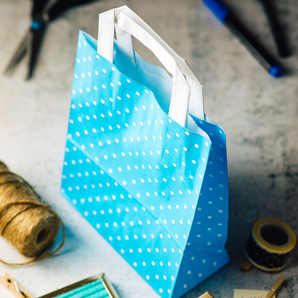 Kraftpapier-Tragetaschen M, 22 + 10 x 31 cm, hellblau weiß gepunktet