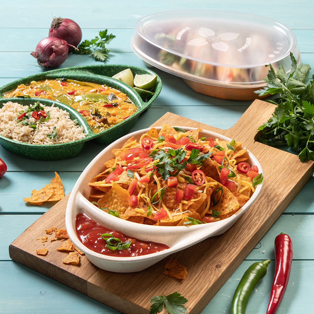- OVALE MEHRWEGTELLER zeigen der Kundschaft Ihren Mut zur Nachhaltigkeit weil sie die Essen-Box mit Fächern zuhause z.B. als Fingerfood Schalen oder für Chips und Süßigkeiten weiter nutzen können