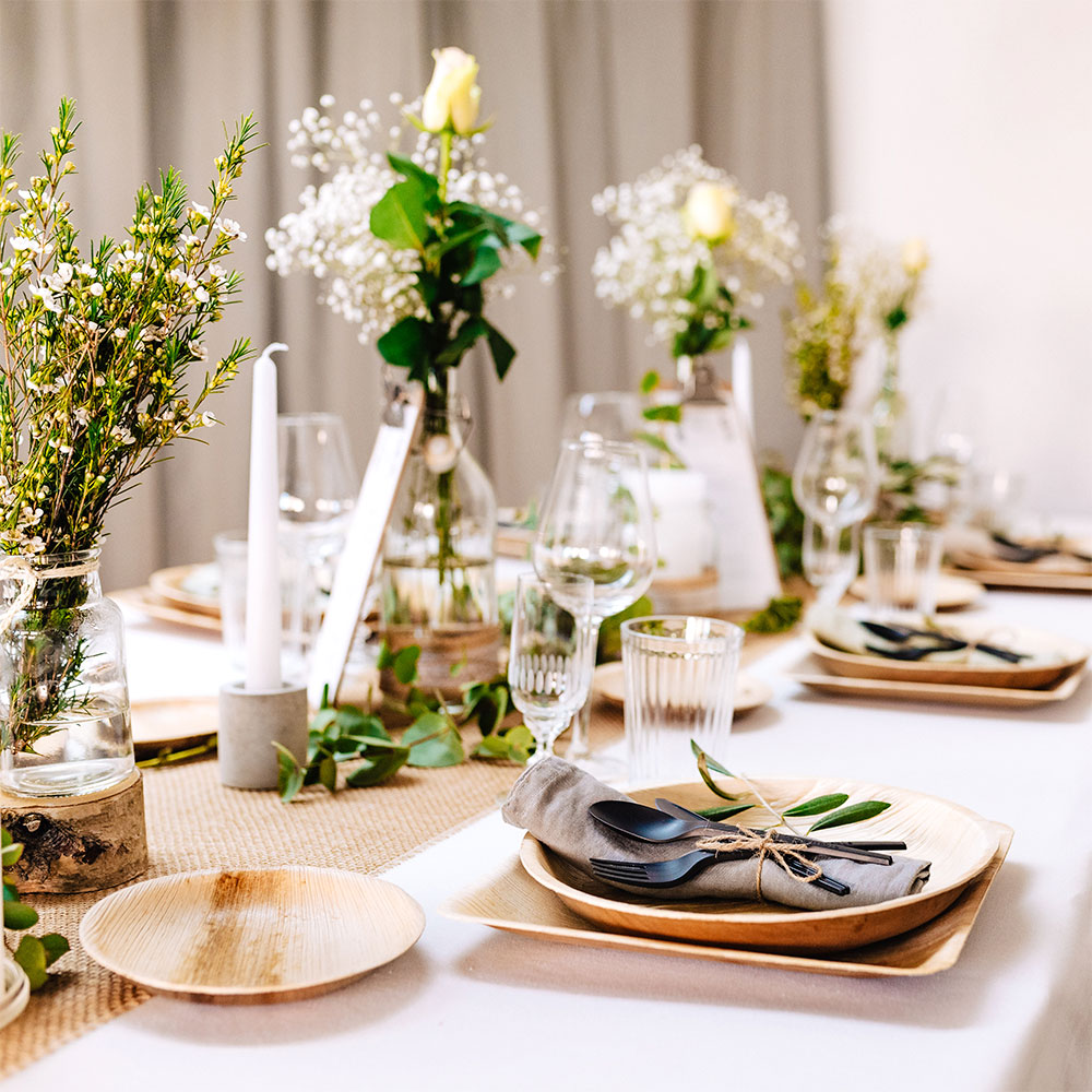 Das moderne Design mit dem kleinen Soßenrand und der natürlichen, individuellen Maserung des Blattes, macht unser Einweg Geschirr Set zum Eyecatcher für jede Party Tischdekoration