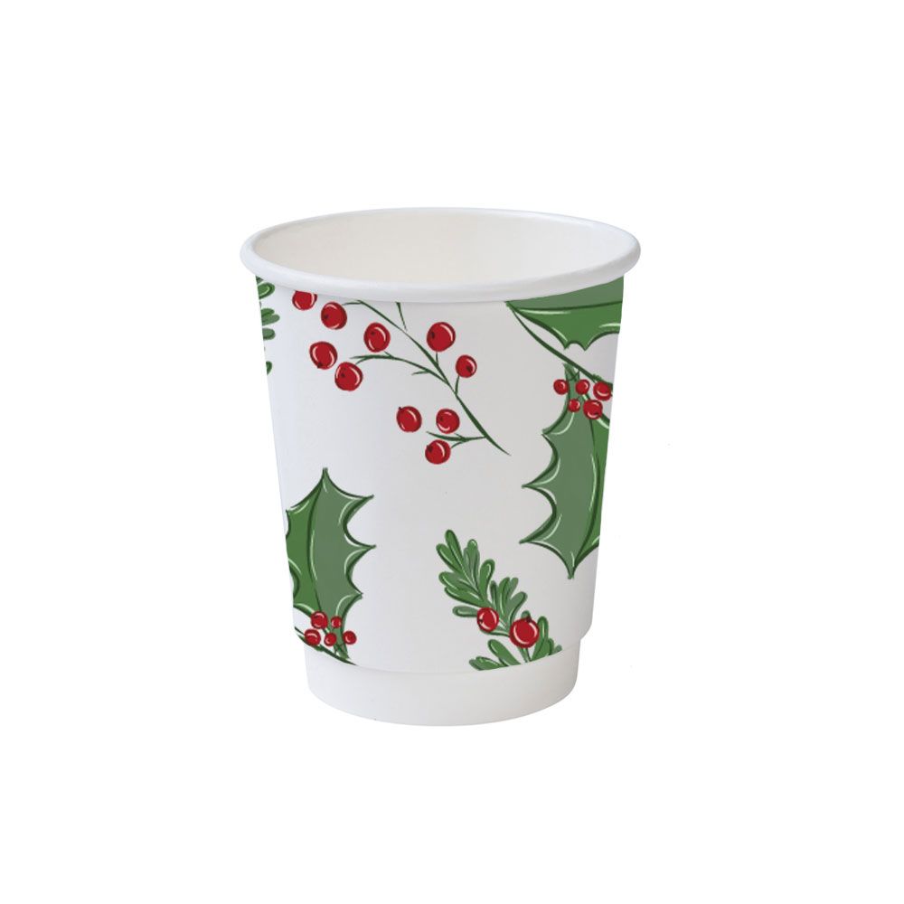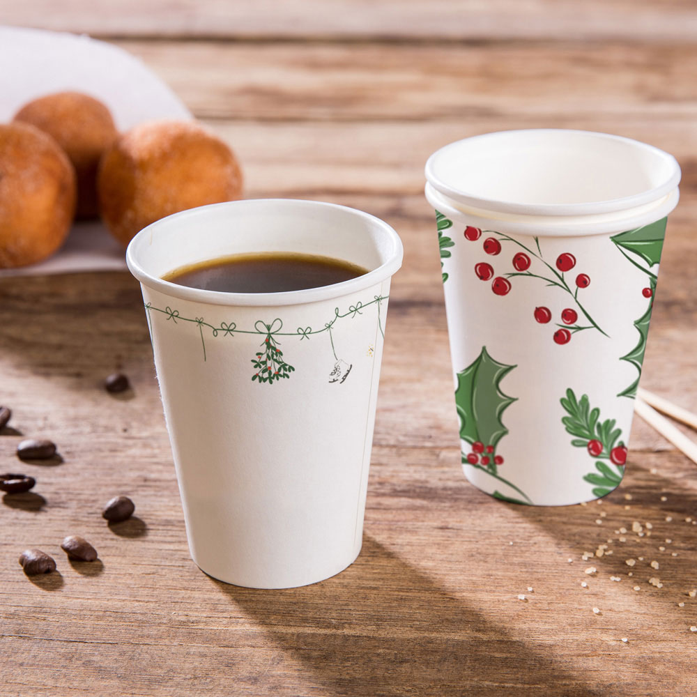 Biozoyg Becher aus Pappe als Heißgetränkebecher oder Kaltgetränkebecher ! Sie wollen sich unnötigen Abwasch ersparen, aber trotzdem Ihr Engagement für die Umwelt zeigen? Dann sind unsere Einwegbecher biologisch abbaubar - als nachhaltige Produkte - die perfekte Alternative für Ihre Veranstaltungen und Partys. Unser Take-Away-Behälter ist ebenfalls ideal als Gastro-Zubehör in der Vorweihnachtszeit oder am Christkindlesmarkt als Glühwein-Becher oder für andere Heißgetränke wie Chai Latte - als Kaffee Pott - als Kakaobecher für Heiße Schokolade oder sogar als Suppenbecher to go uvm. Die 12 oz und 8 oz Becher gibt es in Winteredition #1, eine großflächige Dekoration - grüne Blätter und rote Beeren . Wintermotiv #2 ist dezent mit einem grünen Band mit Schleifen und Anhängern verziert.