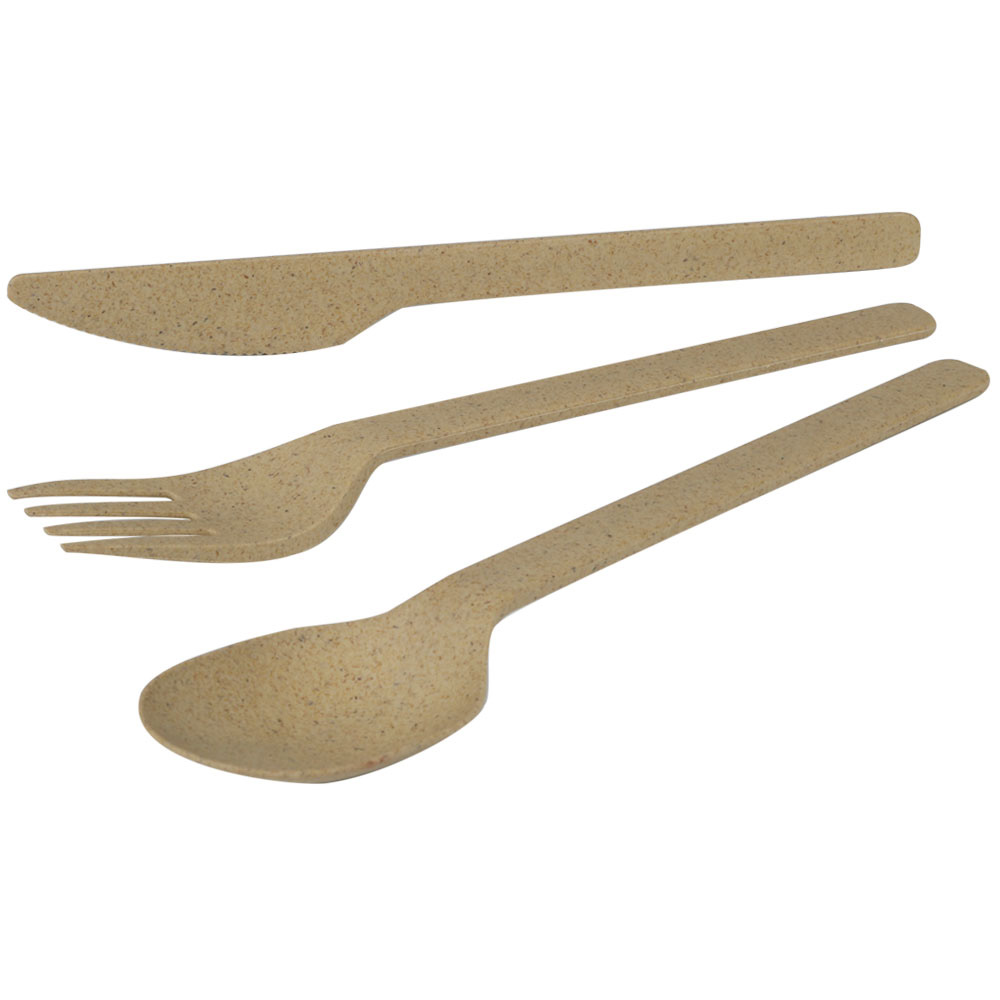 Das Messer, Gabeln und Löffel Set besteht aus einem vollkommen neuartigen Gemisch aus dem pflanzenbasierten Biokunststoff PLA und Holzmehl. Bei dem Holzmehl handelt es sich um ein Abfallprodukt der Holzindustrie, wobei das verwendete Holz aus nachhaltiger Forstwirtschaft stammt.