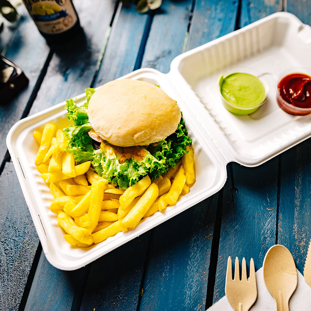 Die quadratischen Take-Away-Behälter eignen sich besonders für Fast- und Finger Food. Dabei können auch öligere Gerichte wie frittierte Teigtaschen sicher abgepackt werden. Die Boxen sind wasser- und fettresistent - geeignet für Speisen von - 25 °C bis 220 °C. Zuckerrohr ist von Natur ein besonders robustes Material, sodass keine zusätzliche Beschichtung notwendig ist.