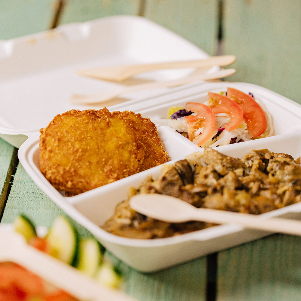 Nachhaltige 3-teilige Zuckerrohr-Menübehälter von BIOZOYG - Unsere Take-Away-Box ist so umweltfreundlich, weil sie wirklich aus Zuckerrohr gemacht wird. Nach dem Pressen des Saftes in der Zuckerproduktion wird das verbliebene Rohr zu einem Cellulosebrei - der sogenannten Bagasse - zermahlen. Daraus werden schließlich unsere Zuckerrohr-Schalen gepresst. Das Tolle ist, dass keine weitere Beschichtung notwendig ist, da die Bagasse von sich aus wasser- und fettresistent ist. So naturbelassen kann die Lunchbox aufklappbar nach Gebrauch ganz einfach kompostiert werden. Alles entsprechend der DIN 13432. Das macht unsere Essensschachtel zu einer nachhaltigen Lösung für Ihre Außer-Haus-Gerichte. Die 3 Kammern der Klappdeckelbox werden durch Trennstege voneinander getrennt. Die Lunchbox-To-Go hat ein sehr leichtes Gewicht und ist unbeschichtet. Trotzdem ist sie dabei sehr stabil und kann sowohl für kalte als auch heiße Speisen genutzt werden, ohne dass der Menüteller mit Deckel unangenehm durchweicht. Unsere Menü Schalen mit drei Kammern eignen sich besonders für Take-Away-Speisen mit mehreren Komponenten, da man sie sauber voneinander trennen kann. Die Menüschalen mit Deckel können bis zu - 5 °C für ca. 30 min gekühlt und bis zu 100 °C für ca. 30 min erwärmt werden. Die To-Go-Box kann man also problemlos im Tiefkühlschrank lagern und in der Mikrowelle warm halten. In jedem Fall eignen sie sich hervorragend für das tägliche Außer-Haus-Geschäft. Egal wo diese tollen Essensbehälter für unterwegs zum Einsatz kommen, sie transportieren Ihr Umweltbewusstsein direkt zum Kunden. So bleiben Sie im Gespräch, immer das entscheidende Stück besser im Geschäft und können Ihre Speisen mit gutem Gewissen servieren.