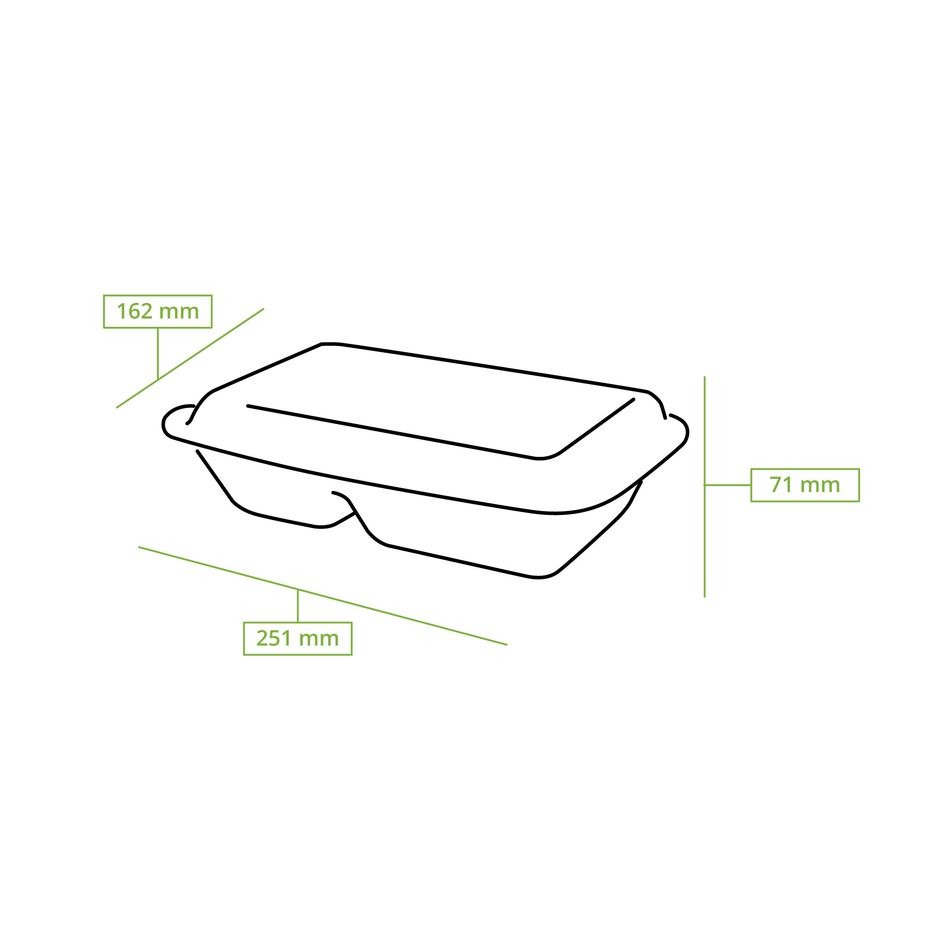Die rechteckigen Einwegschüsseln mit Klappdeckel sind hervorragend als umweltfreundliche Take Out Box und To Go Verpackung geeignet. Durch die Teilung der Einweg-Box Take Away im Inneren können z.B. Vor- und Hauptspeise gemeinsam verpackt werden.