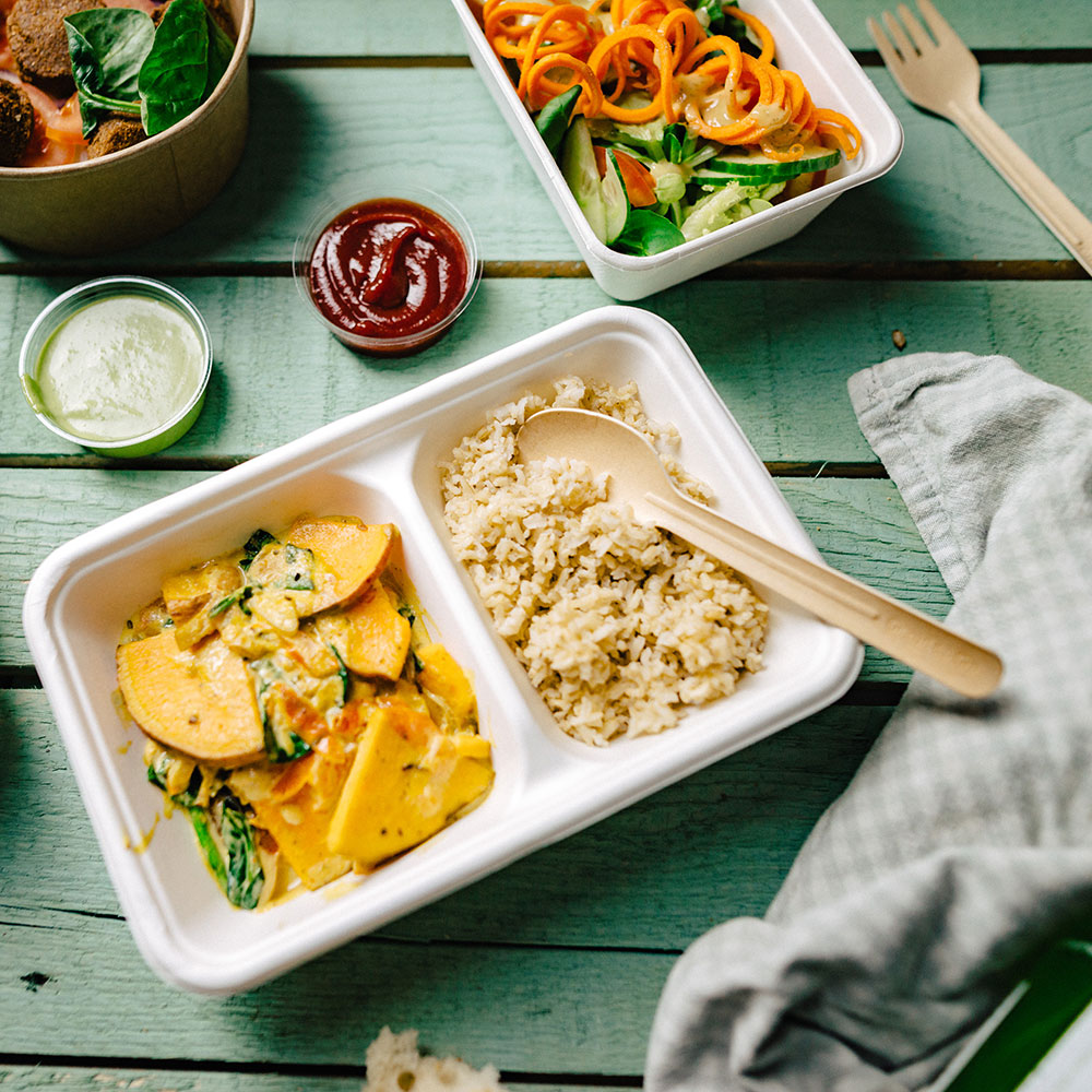 Die robusten Menü-Schalen eignen sich besonders für Gerichte mit mehreren Komponenten. In den zwei Kammern kannst Du die Speisen sauber voneinander trennen, wie z. B. Kartoffelsalat mit Würstchen. Dabei können auch Gerichte mit viel Sauce oder öligere Gerichte sicher abgepackt werden.
