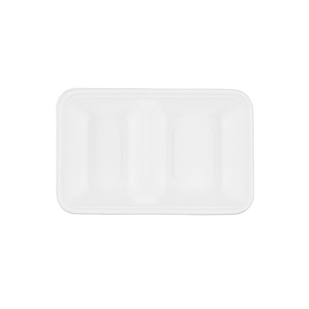 - ARTIKEL-DETAILS Eckige Schalen aus Zuckerrohr-Bagasse I Füllvolumen 1000 ml I 23 x 14,5 x 5 cm I 2 Kammern I rechteckig I einfarbig weiß & unbedruckt I Passende Deckel-Sets sind separat erhältlich.